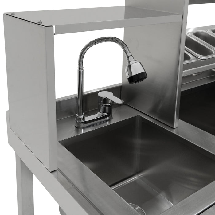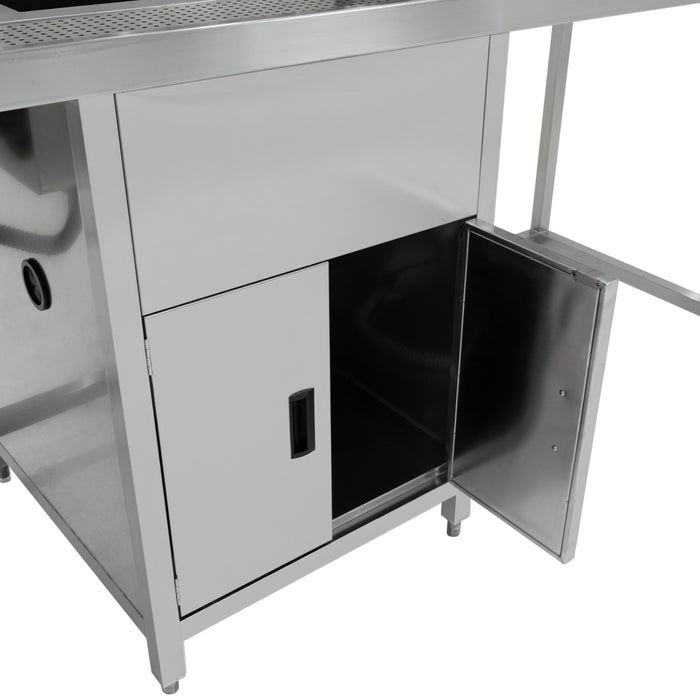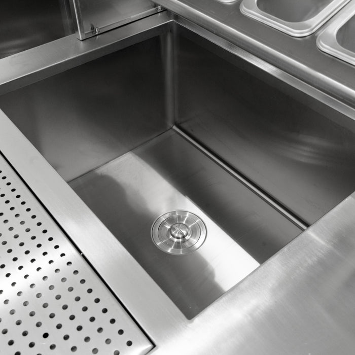 Hygiene is a top priority in this thoughtfully designed workstation. The built-in sink, featuring a flexible mixer tap, drip tray, and glass refresher, makes cleaning and rinsing quick and effortless. Whether it’s refreshing glassware, rinsing tools, or tidying up after a rush, these features help you maintain impeccable cleanliness standards throughout the day. Crafted from stainless steel, the workstation is not only sleek in appearance but also resistant to wear, stains, and spills, making it easy to clean and perfect for heavy daily use.