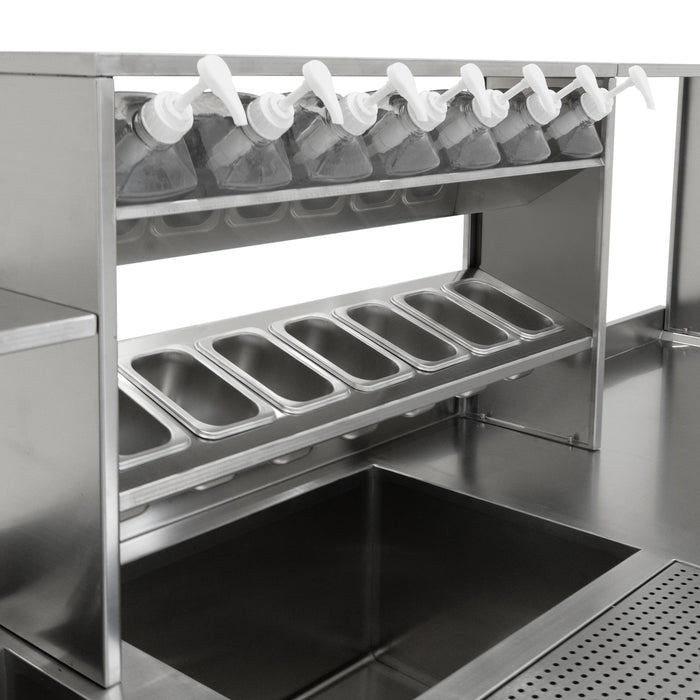 A spacious ice well ensures you’ll never run out of ice during high-demand periods. With ample capacity to store large amounts of ice, you can focus on serving drinks without the disruption of frequent refills. Additional storage options, such as a built-in cupboard and countertop shelves, give you space to neatly organise your tools, accessories, and ingredients, keeping everything you need at your fingertips while maintaining a clutter-free workspace.