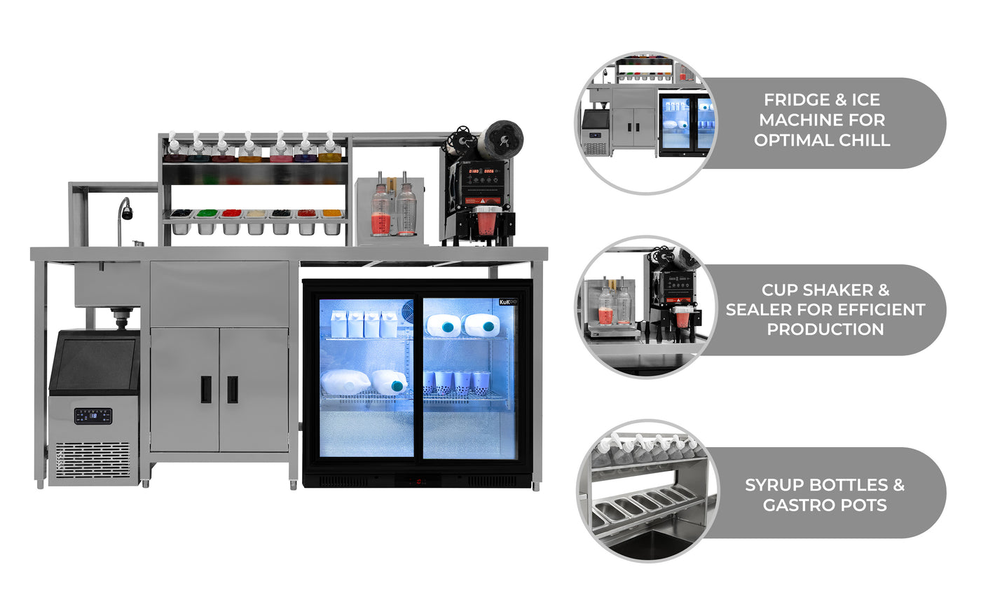A complete package, this workstation includes essential tools like a back bar cooler, ice maker, electric tea shaker and automatic cup sealing machine to create a fully optimised setup from day one.