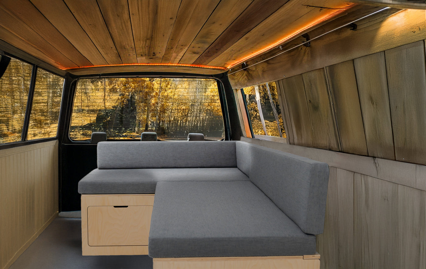 Transform your camper van into a practical and inviting space with our premium L-shaped sofa bed.