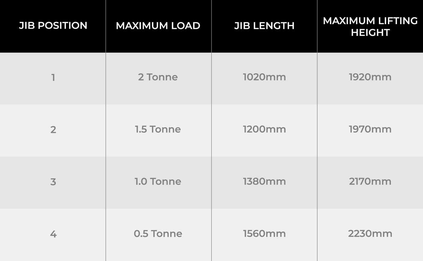 The lifting arm can be extended according to the weight of the load, up to a maximum height of 223cm, and adjusted between the four fixed JIB positions for safe lifting and transporting of heavy machinery.