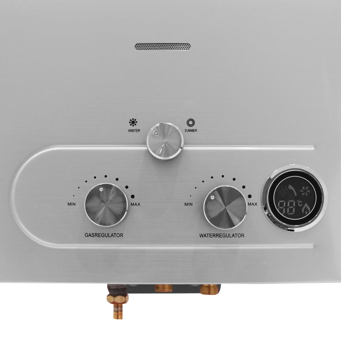 Built for practicality and mobility, the shower is mounted on a durable trolley fitted with 10-inch pneumatic tires, allowing it to move effortlessly over various terrains. The gas cylinder door discreetly conceals the cylinder for a neat and professional appearance, while the back panels with pre-drilled holes make attaching the boiler a breeze.