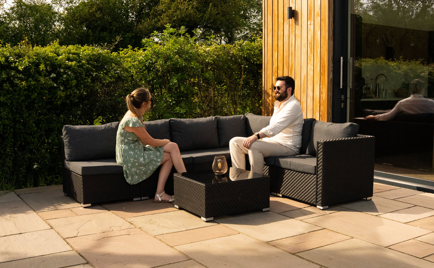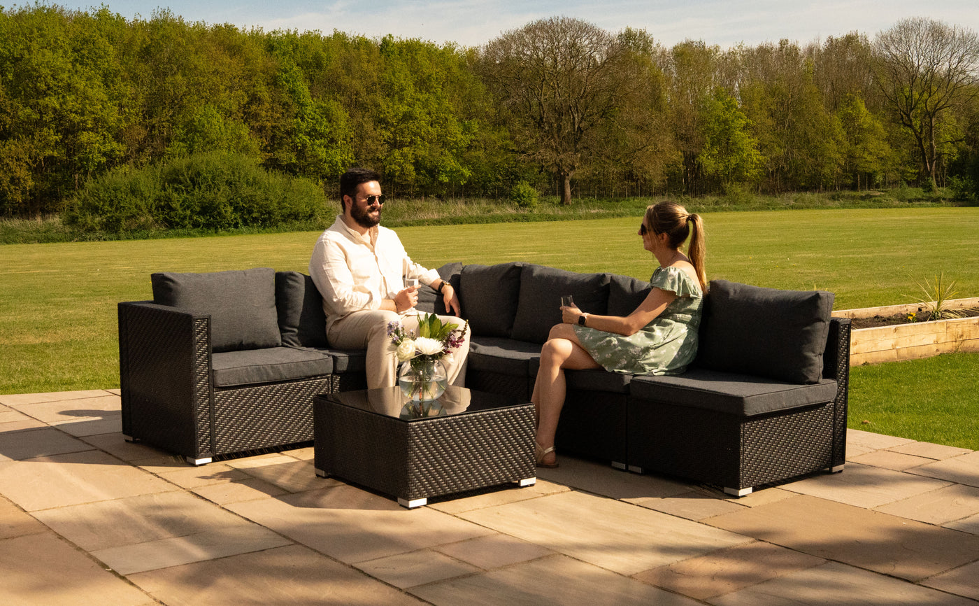 This rattan modular furniture set is designed to transform your garden, patio, or conservatory into a sophisticated and versatile space for relaxing and entertaining. Finished in sleek black, this set includes 6 modular seating pieces and a matching table, allowing you to customise your layout to suit any occasion - whether it's a cosy evening with loved ones or a lively summer get-together.